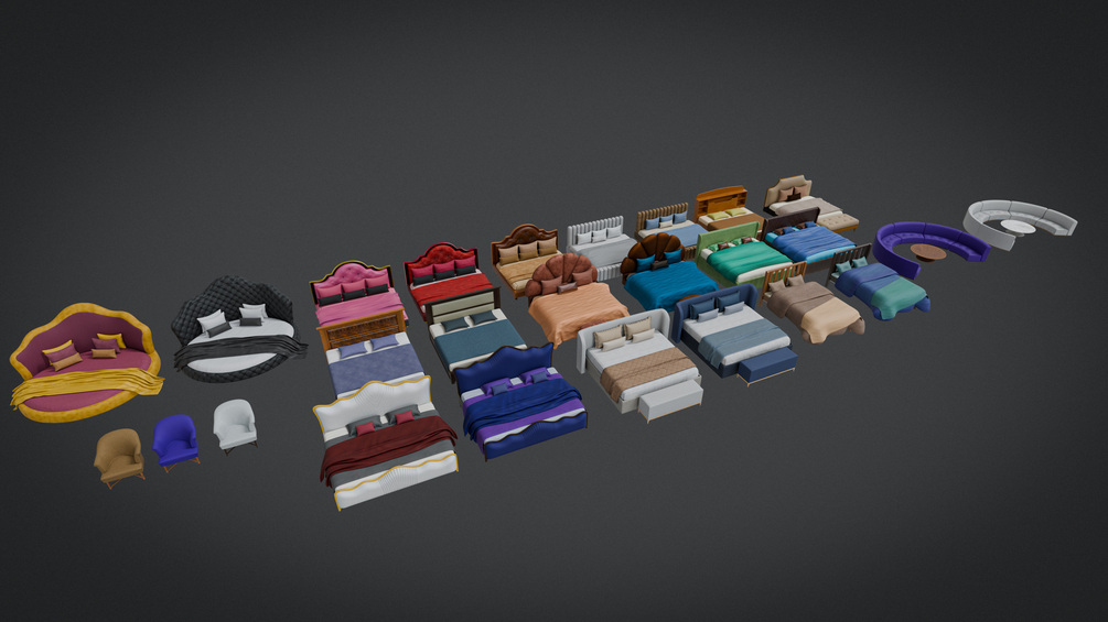 22 Beds, 1 Chair and 1 Sofa with multiple Color and Shape Variations.